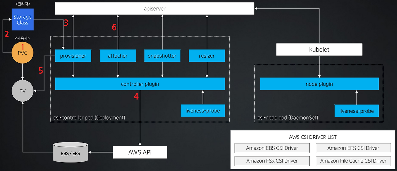 AWS API를 호출하면서 AWS 스토리지를 관리하는 CSI-Controller와 kubelet과 상호작용하면서 AWS스토리지를 pod에 마운트하는 CSI-Node가 있습니다.