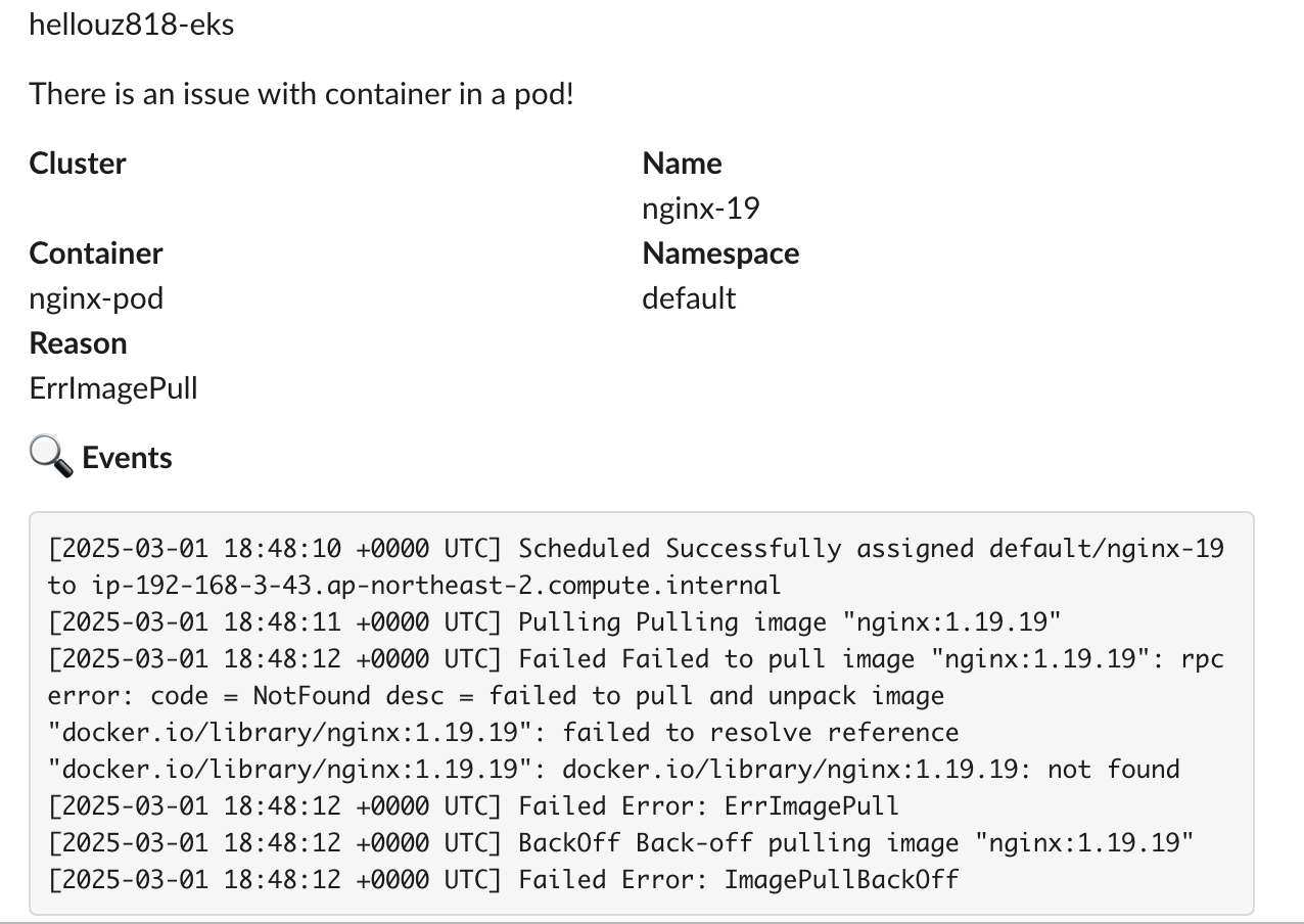 time="2025-03-01T18:48:12Z" level=info msg="sending to slack event: &{nginx-19 nginx-pod default ErrImagePull [2025-03-01 18:48:10 +0000 UTC] Scheduled Successfully assigned default/nginx-19 to ip-192-168-3-43.ap-northeast-2.compute.internal\n[2025-03-01 18:48:11 +0000 UTC] Pulling Pulling image \"nginx:1.19.19\"\n[2025-03-01 18:48:12 +0000 UTC] Failed Failed to pull image \"nginx:1.19.19\": rpc error: code = NotFound desc = failed to pull and unpack image \"docker.io/library/nginx:1.19.19\": failed to resolve reference \"docker.io/library/nginx:1.19.19\": docker.io/library/nginx:1.19.19: not found\n[2025-03-01 18:48:12 +0000 UTC] Failed Error: ErrImagePull\n[2025-03-01 18:48:12 +0000 UTC] BackOff Back-off pulling image \"nginx:1.19.19\"\n[2025-03-01 18:48:12 +0000 UTC] Failed Error: ImagePullBackOff previous terminated container \"nginx-pod\" in pod \"nginx-19\" not found map[]}"