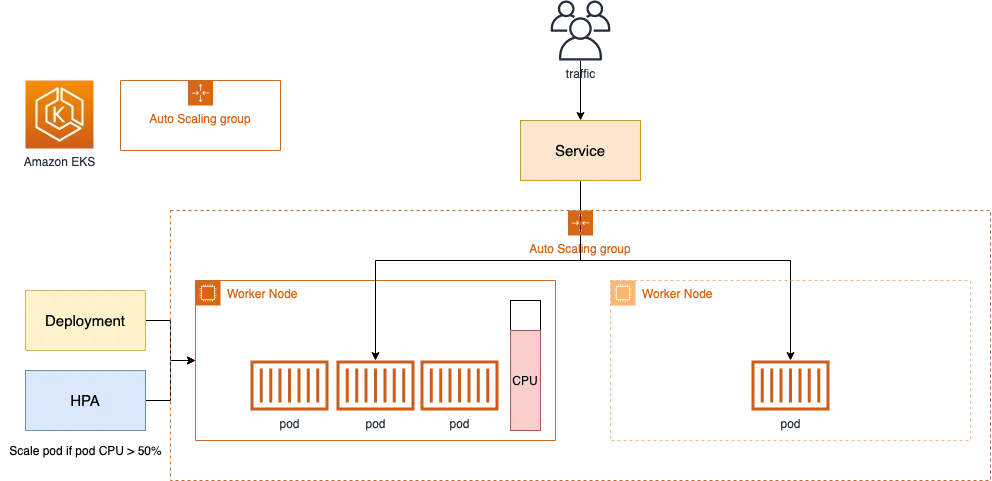 - 특정 시간을 간격으로 사용률을 확인하여 스케일 인/아웃을 수행합니다. 그리고 AWS에서는 Auto Scaling Group(ASG)을 사용하여 Cluster Autoscaler를 적용합니다.