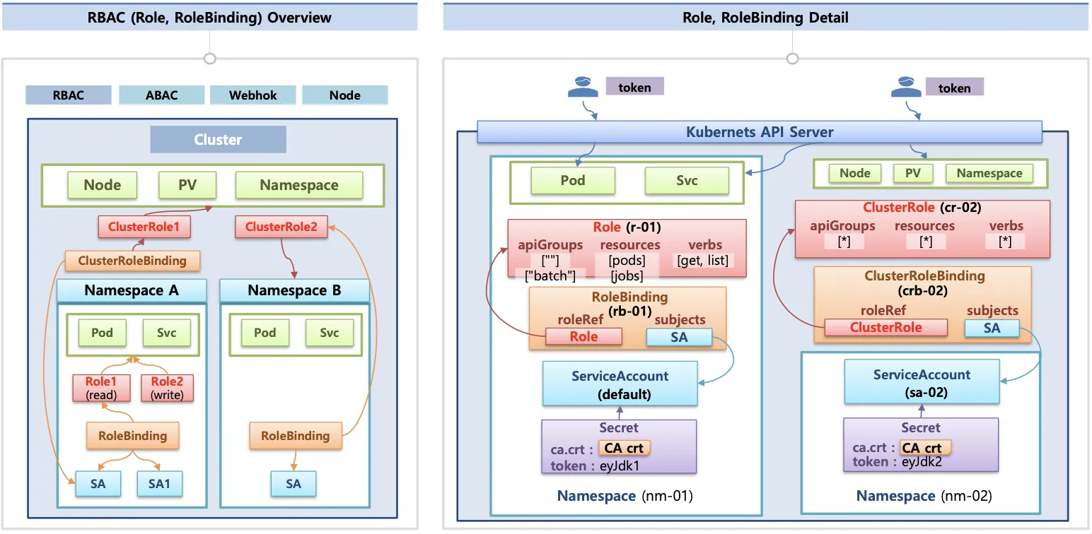 - ClusterRoleBinding : ClusterRole을 클러스터 전역의 사용자, 그룹, 서비스 어카운트에 연결