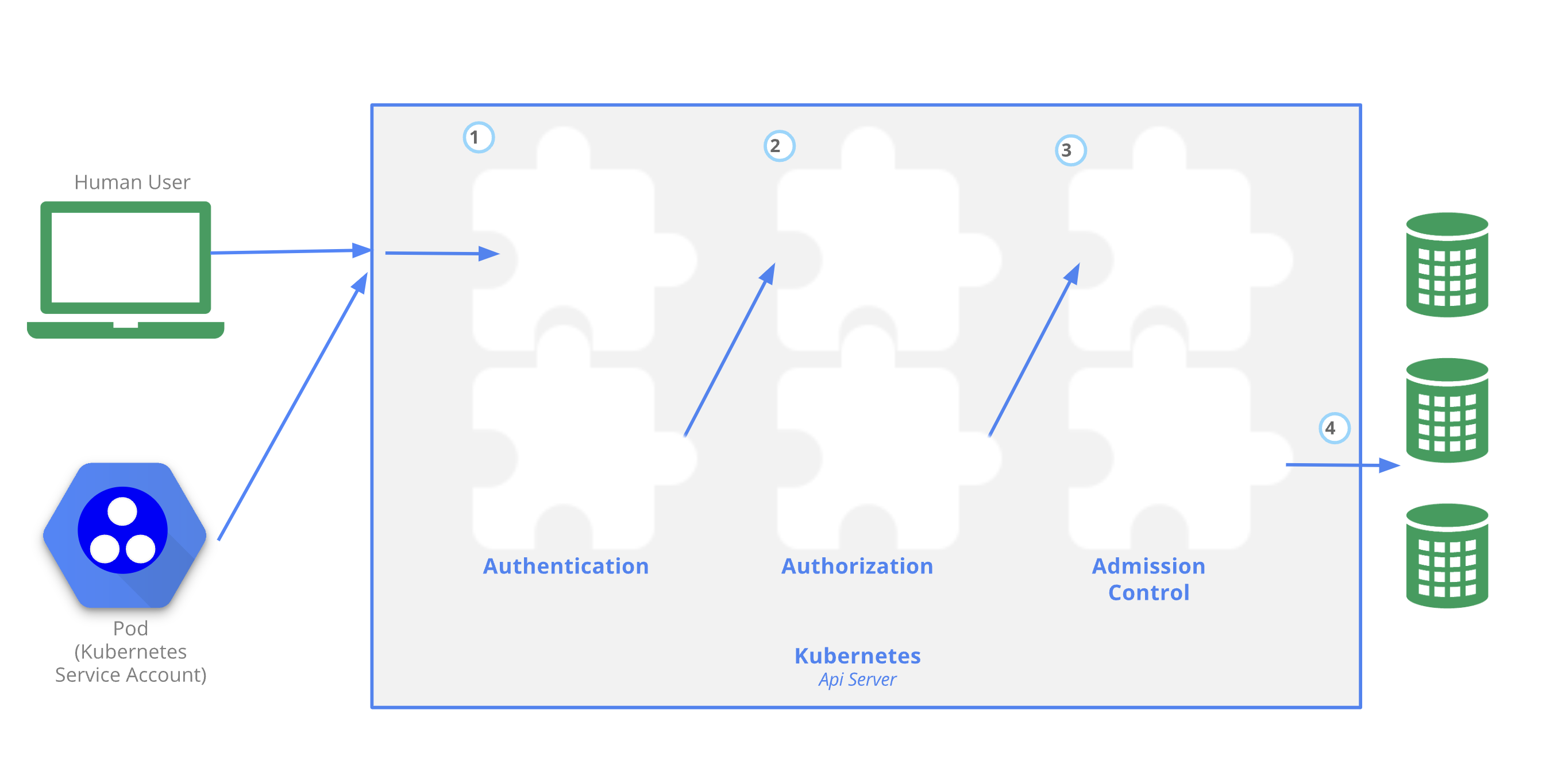 아래 그림과 같이, 실제 사용자(사람)와 파드(서비스 어카운트) 모두 API 서버에 접근하기 위해 권한을 부여받을 때 다음과 같은 단계를 거칩니다.