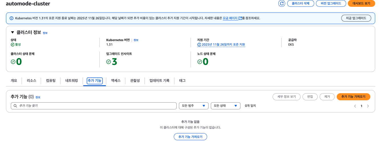 콘솔에서 확인했을 때 EKS Auto mode가 활성화 된 것을 알 수 있으며, 별도의 노드 풀, 노드가 없이 내장 노드 풀을 사용하는 것을 알 수 있습니다. 또한, 기존에 사용하던 CoreDNS 등 별도의 Add-on도 없는 것을 알 수 있습니다.