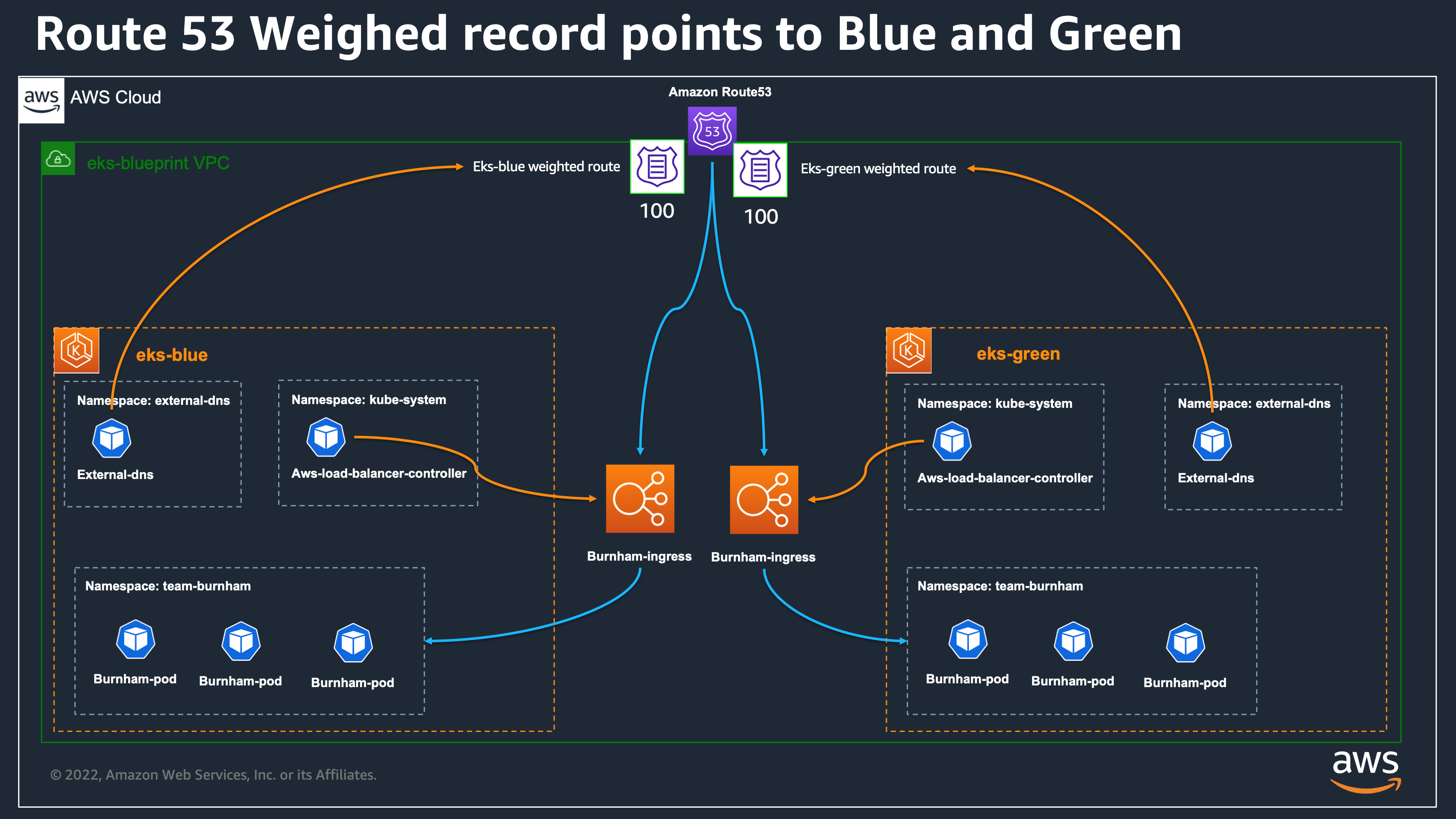 Blue/Green Migration This directory provides a solution based on EKS Blueprint for Terraform that shows how to leverage blue/green or canary application workload migration between EKS clusters, using Amazon Route 53 weighted routing feature. The workloads