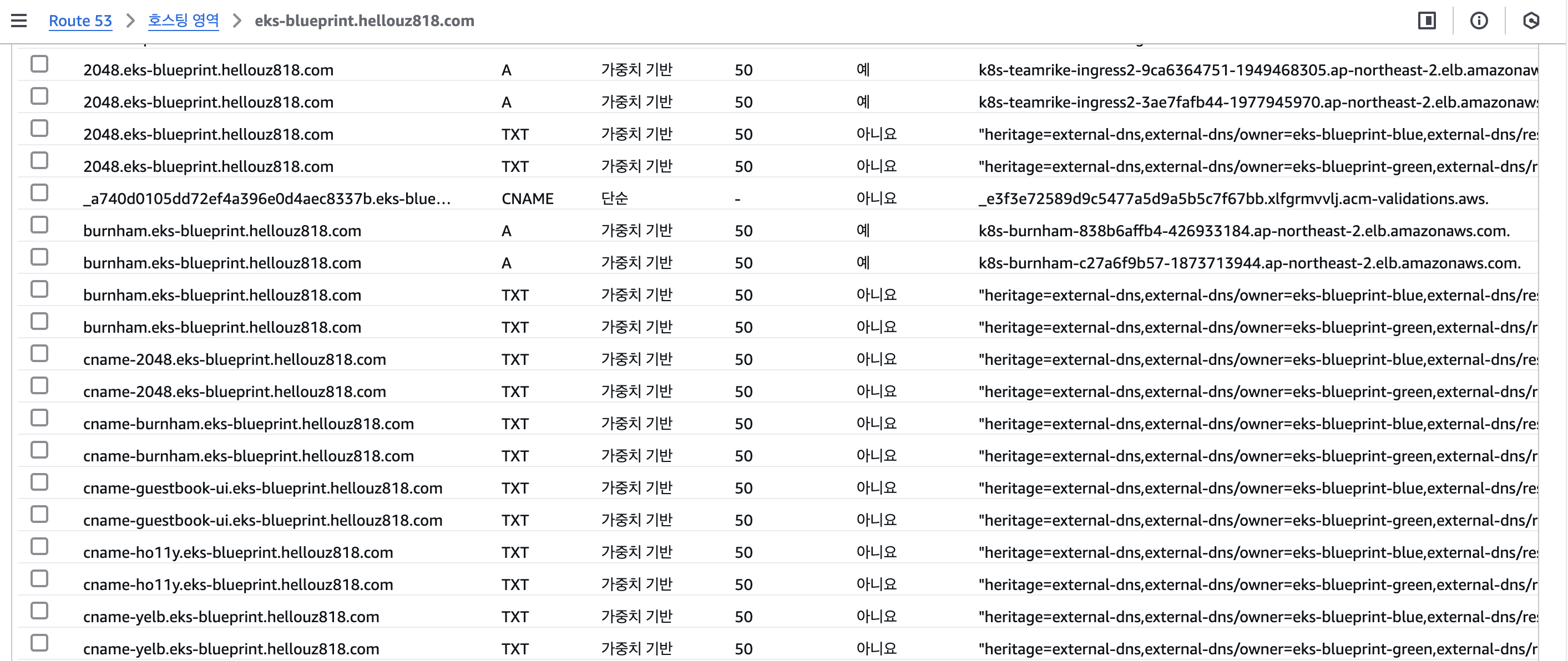 - 동일한 Route53 Hosted Zone을 공유하여 각 클러스터가 생성하는 ALB 도메인을 Route53에 자동 등록 가능