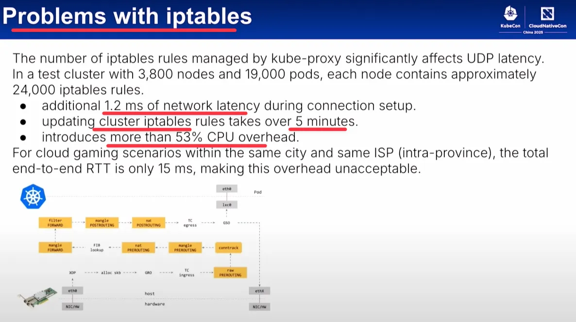 실제로 대규모 환경에서 iptables는 치명적인 병목 요인이 됩니다. KubeCon China 2025 발표 자료에서도 아래와 같은 문제가 지적되었습니다. 즉, 단순하고 작을 때는 문제가 없지만, 노드 수나 파드 수가 많아질수록 심각한 비효율이 발생합니다.