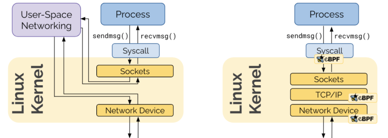실제 프로세스에서 호출 시 일반적인 리눅스 네트워킹 구조를 사용한 경우와 eBPF를 사용한 경우의 호출 흐름을 비교해보겠습니다.