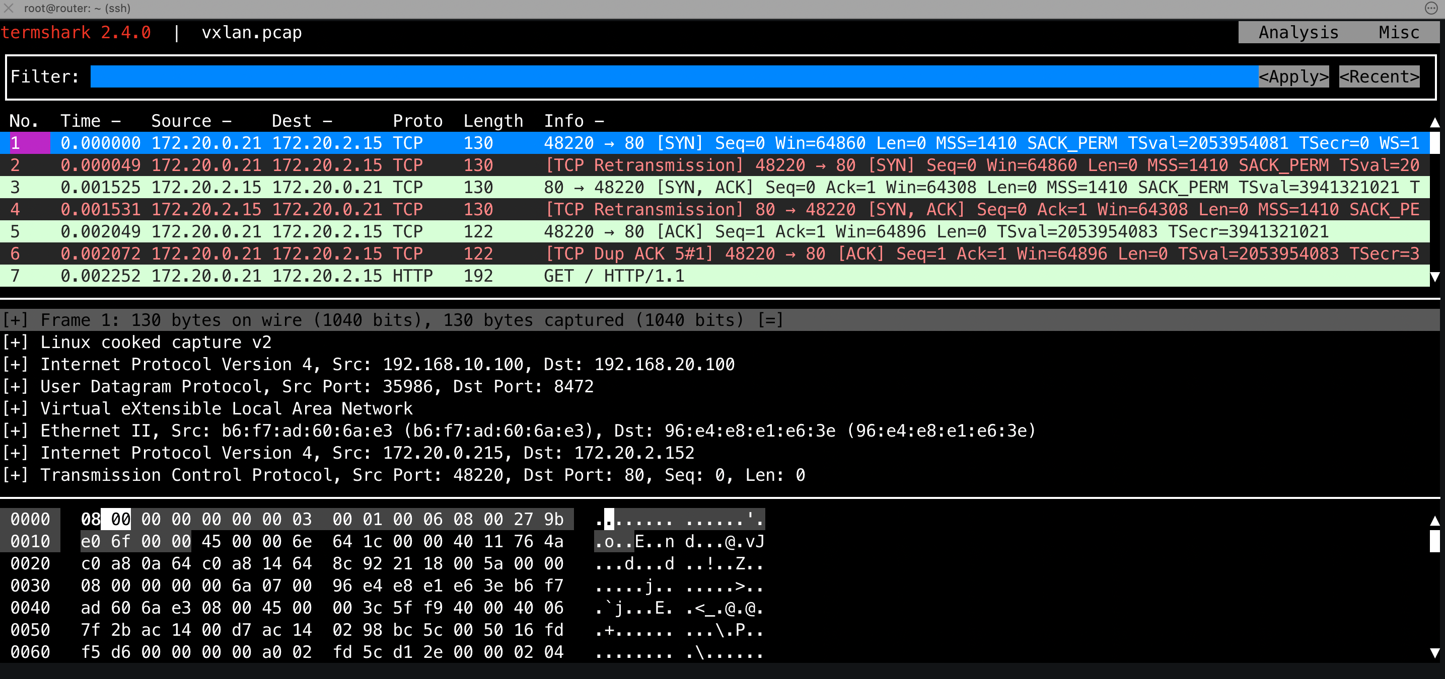 root@router:~# tshark -r /tmp/vxlan.pcap -d udp.port==8472,vxlan