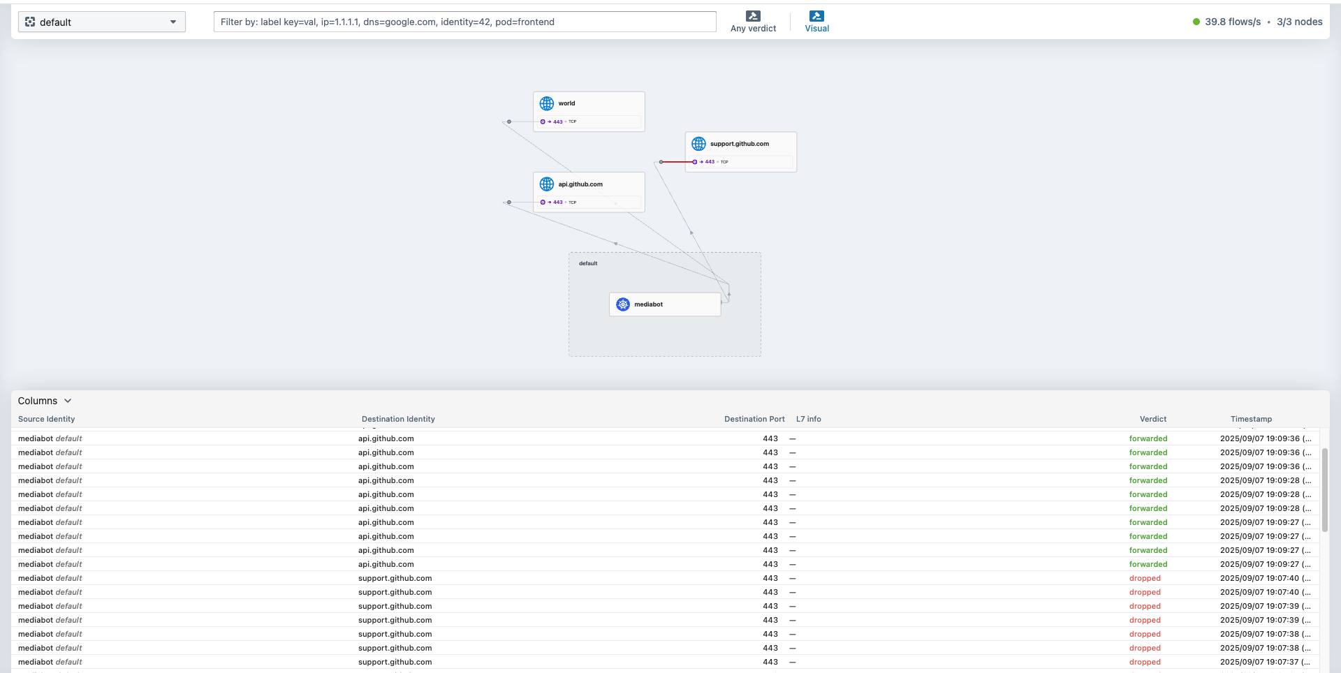 Sep 7 10:07:37.197: default/mediabot:42884 (ID:37240) <> support.github.com:443 (world) Policy denied DROPPED (TCP Flags: SYN)