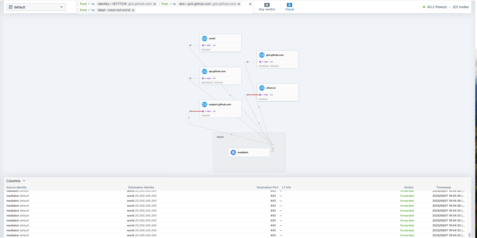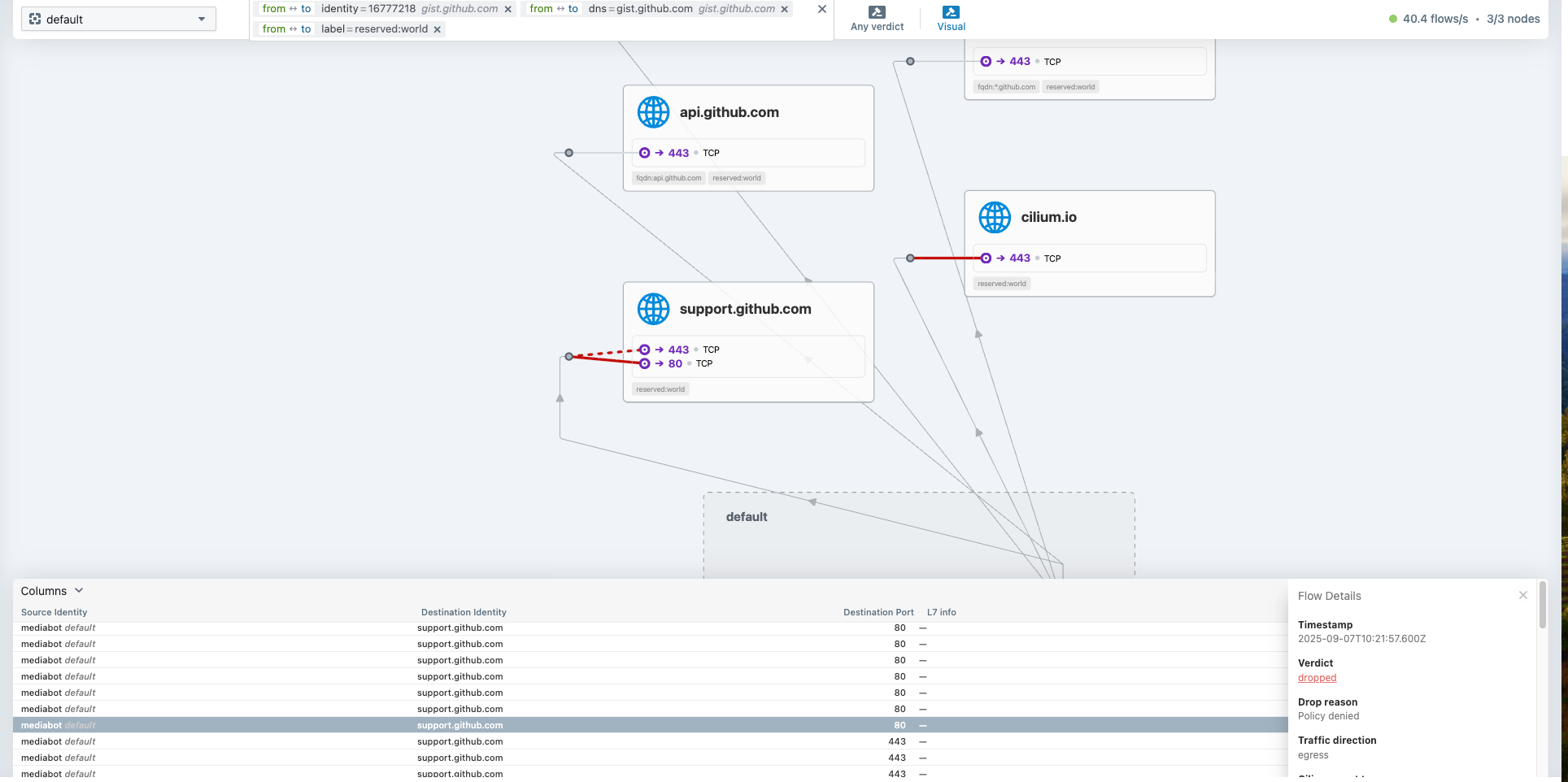 Sep 7 10:07:38.221: default/mediabot:42884 (ID:37240) <> support.github.com:443 (world) Policy denied DROPPED (TCP Flags: SYN)
